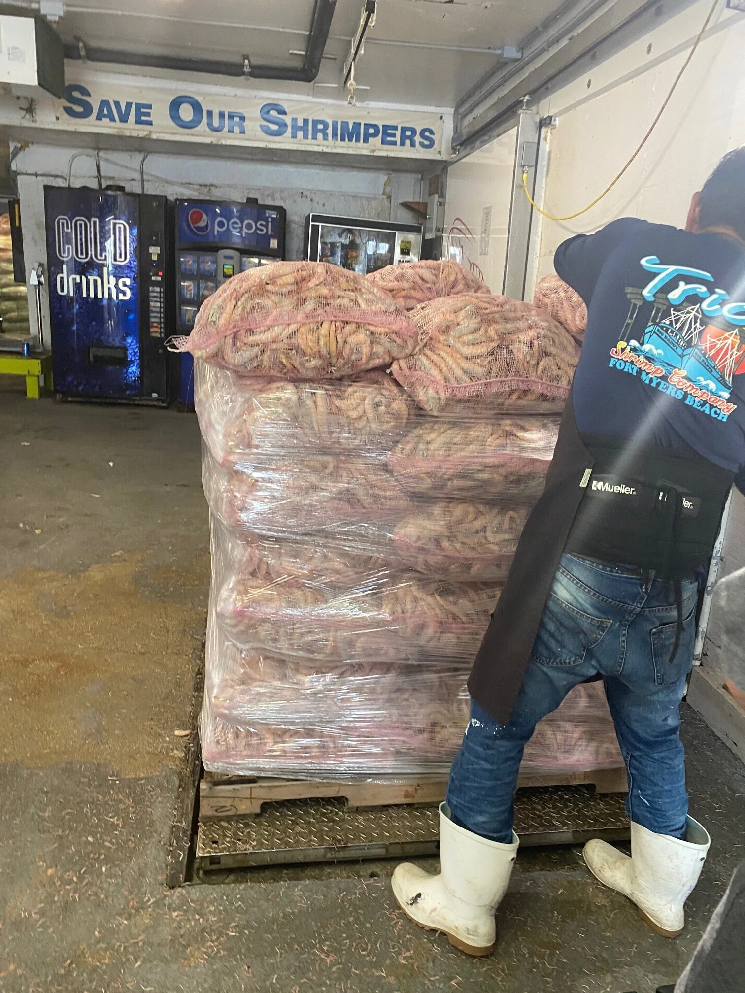 Sacks of frozen shrimp had been riding by on a conveyor since before we arrived—at least an hour. I asked, “Is this much shrimp normal for one trip?”